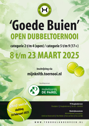 De inschrijving van 't Goede Buien open dubbeltoernooi staat open! Dus schrijf snel in, we zien jullie de middelste twee weken van maart graag weer op onze banen en in de knusse kantine.