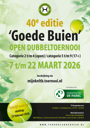 De inschrijving voor 't Goede Buien staat open. Wij nodigen je van harte uit om in te schrijven voor de feestelijk 40ste(!) editie van dit altijd gezellige toernooi, dat wordt gespeeld van 7 t/m 22 maart 2026.